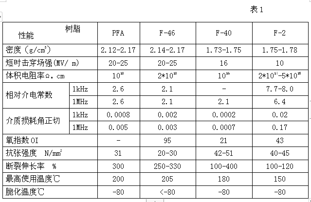 氟塑料種類有聚四氟乙烯(PTFE,簡稱F-4)、四氟乙烯與全氟(正)丙基乙烯基醚的共聚物(PFA)、聚全氟乙丙烯(FEP,簡稱F-46)、乙烯-四氟乙烯共聚物(ETFE,簡稱 F-40)、聚偏氟乙烯(PVDF,簡稱F-2)、聚三氟氯乙烯(PCTFE)、聚氟乙烯(PVF)、四氟乙烯-六氟丙烯-偏氟乙烯的共聚物(THV)等。氟塑料中F-4但綜合性能最好,但加工困難,通常用于電力電纜的有PFA、F-46、F-40、F-2等.材料的電氣機械性能如表1所示。