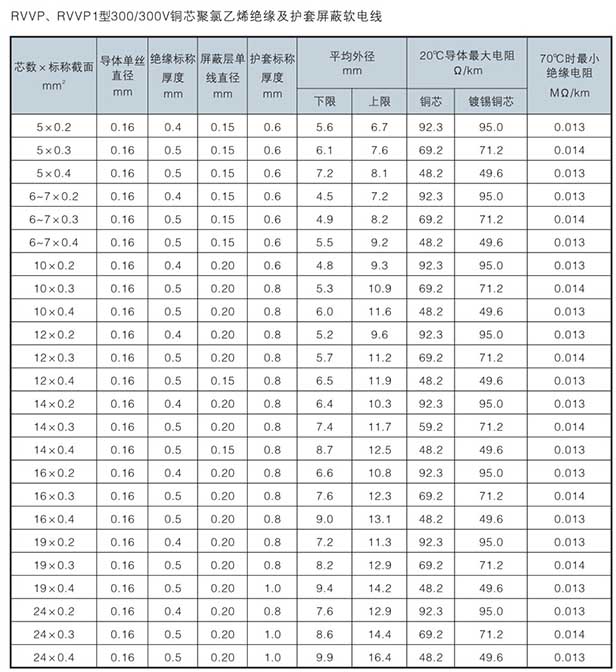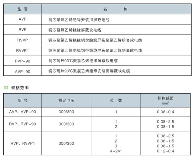 AVP(銅芯聚氯乙烯絕緣屏蔽電線)、AVP-105(銅芯耐熱150℃聚氯乙烯絕緣屏蔽電線)、RVP(銅芯聚氯乙烯絕緣屏蔽軟電線)、RVP-105(銅芯耐熱150℃聚氯乙烯絕緣屏蔽軟電線)、RVVP(銅芯耐熱150℃聚氯乙烯絕緣屏蔽聚氯乙烯護套軟電線)、RVVP1(銅芯耐熱150℃聚氯乙烯絕緣纏繞屏蔽聚氯乙烯護套軟電線)