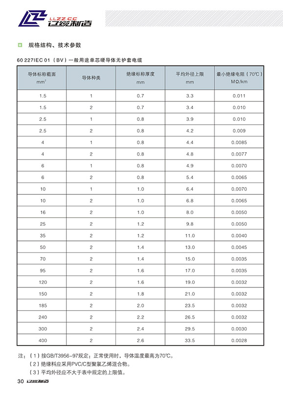 額定電壓450/750V及以下聚氯乙烯絕緣電線電纜型號、名稱和執(zhí)行標準型號名稱額定電壓(V)執(zhí)行標準227 IEC 01 (BV)一般用途單芯硬導體無護套電纜450/750GB 5023227 IEC 02 (RV)一般用途單芯軟導體無護套電纜450/750GB 5023227 IEC 05 (BV)內(nèi)部布線用導體溫度為70℃單芯實心導體無護套電纜300/500GB 5023227 IEC 06