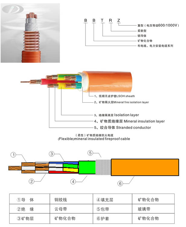 相對傳統(tǒng)的BTTZ剛性礦物絕緣電纜, BBTRZ柔性礦物絕緣電纜是由銅絞線、礦物化合物絕緣、和礦物化合物護套所構成。其采用柔性結構,主要材料均采用無機材料,彌補了結構硬、易燃燒、有毒等缺陷,并且具有一些其他電纜不具有的優(yōu)點,如:耐火、載流量大、耐沖擊電壓、耐機械損傷、無鹵無毒、防爆、防水、耐腐蝕、壽命長、安全、耐過載、耐高溫、成本低等特點。